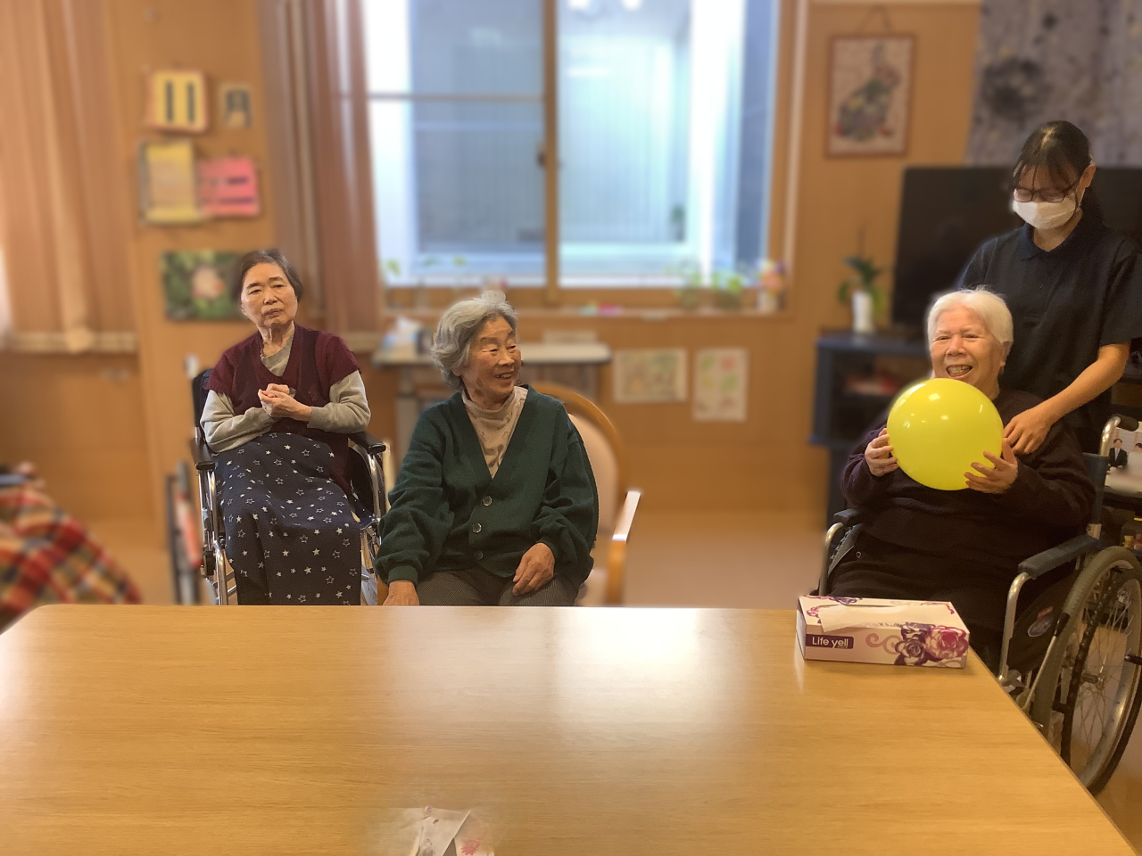 風船バレーを開催しました。職員もお手伝いさせていただきます。目標10回達成!皆さんで楽しく身体を動かしました🎈