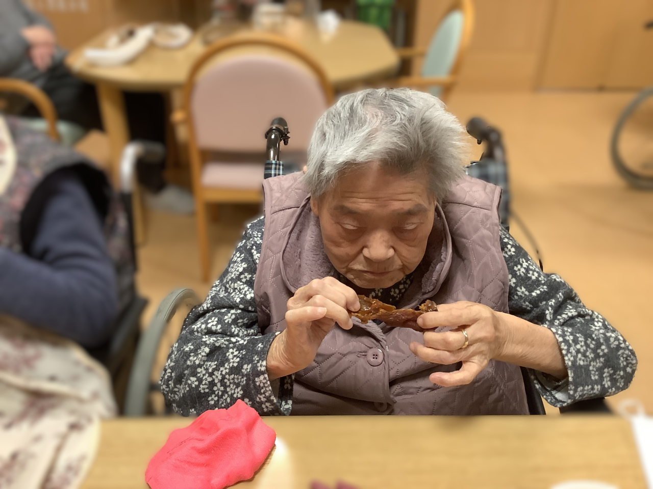 皆さんで作った干し柿を召し上がっている様子です。柿の甘さがちょうどよく、お茶と一緒に食べると格別です。来年もまた、皆さんで作りましょうね。