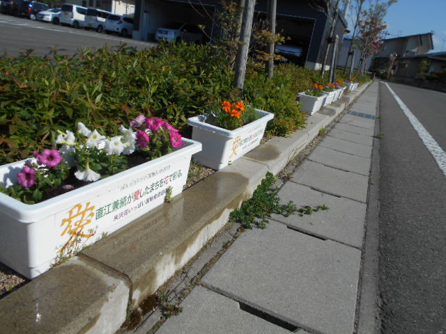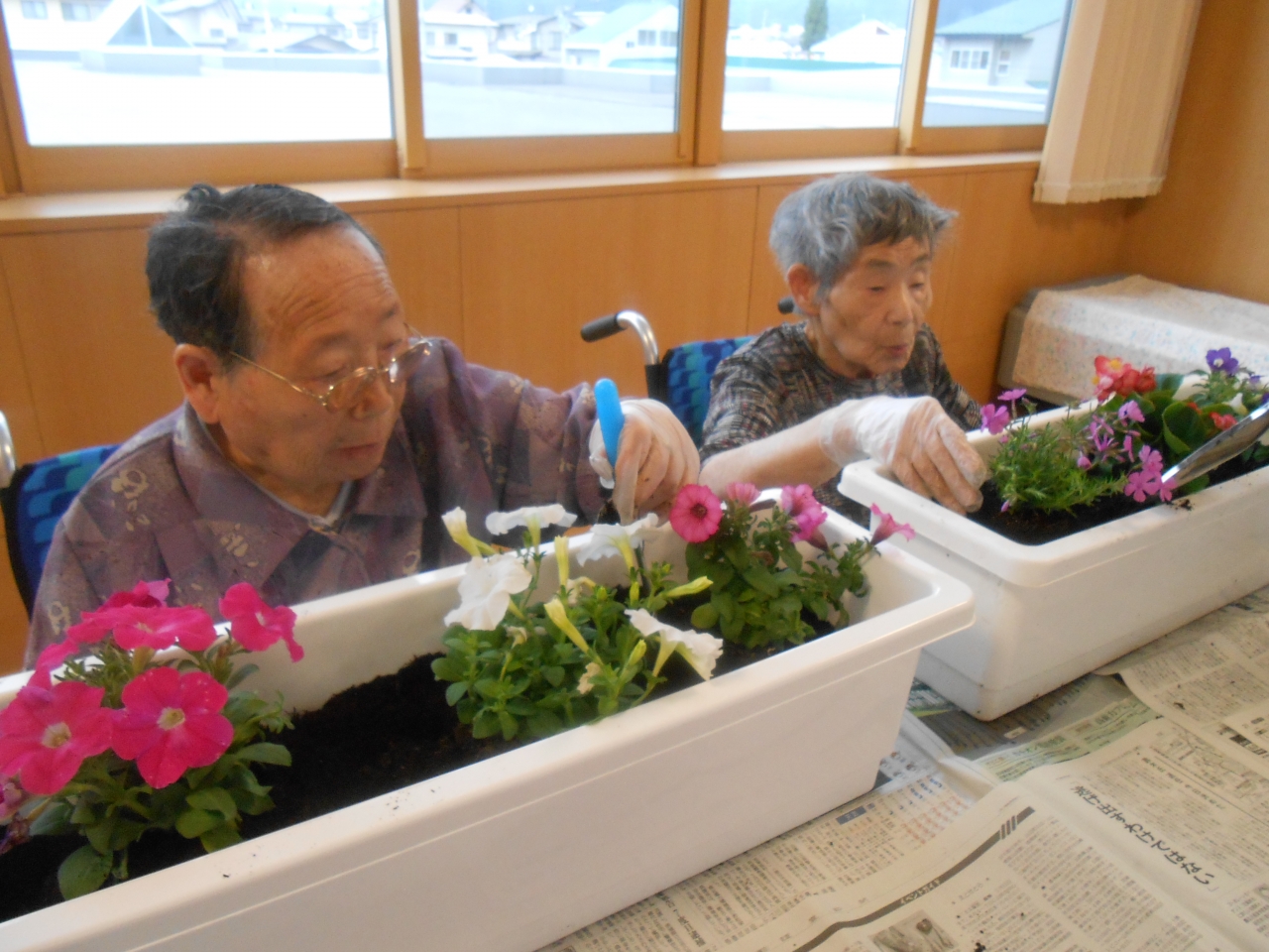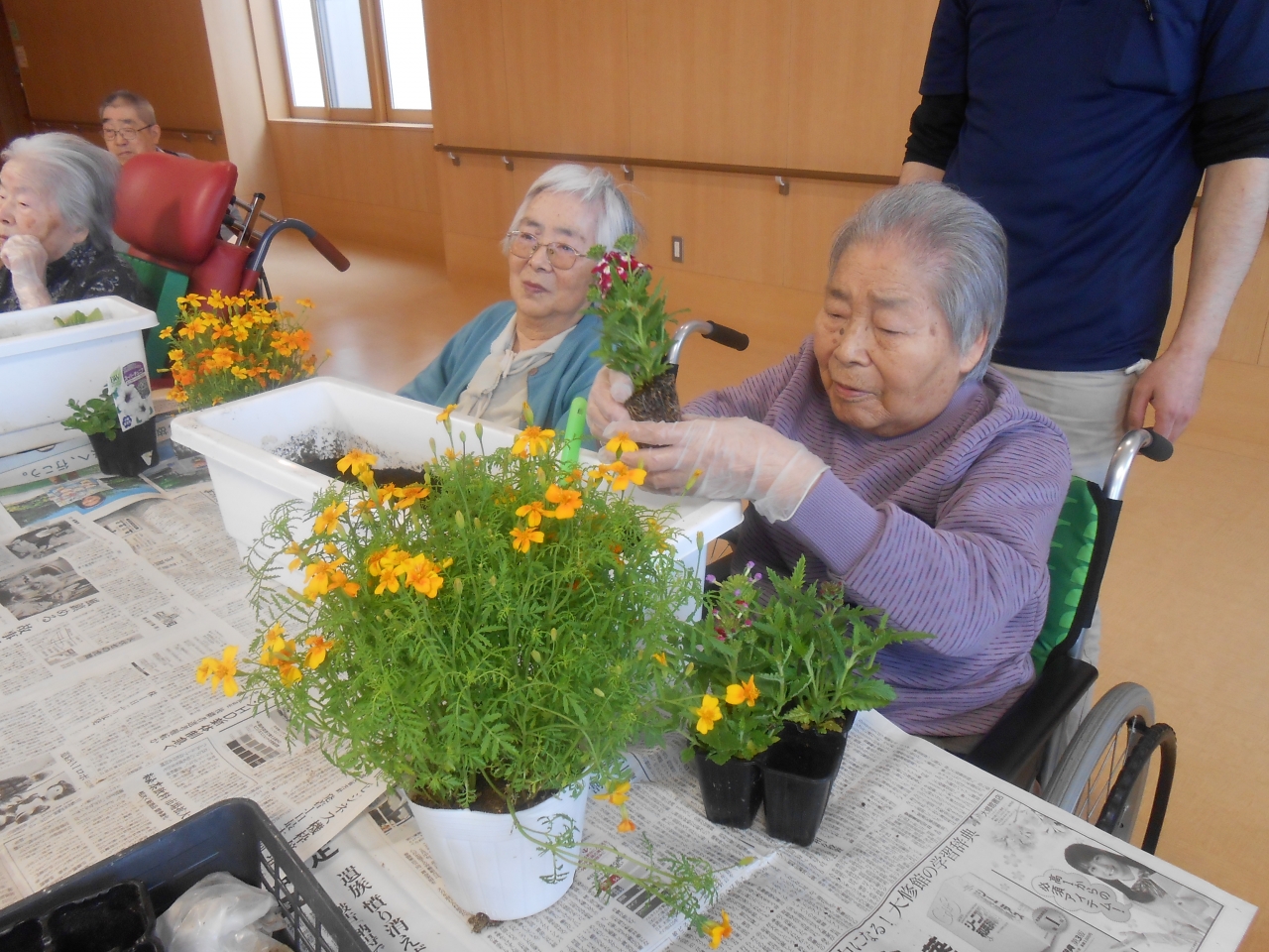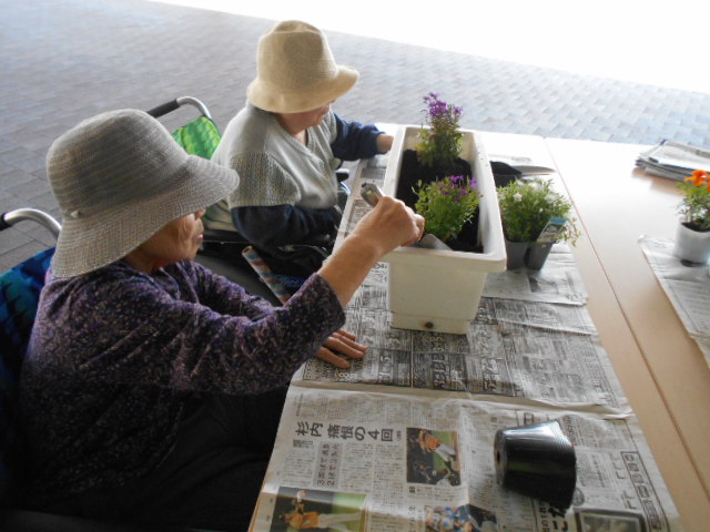 当施設では毎年「米沢花いっぱい運動」に参加しています。今年も頂いたフラワーポットに花植えをしました。