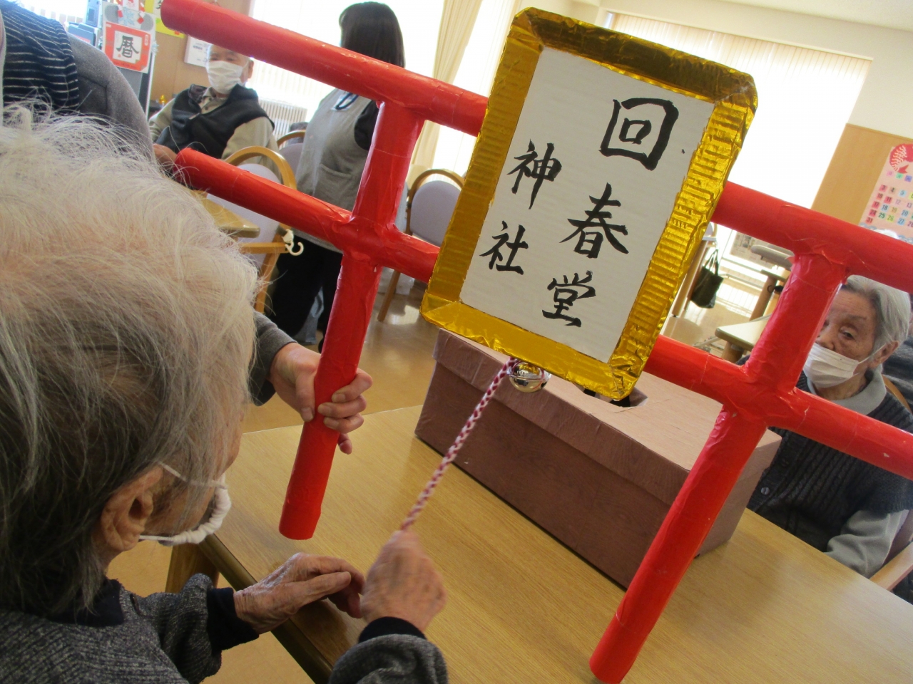 新年あけましておめでとうございます。デイサービス回春堂花沢では1/2よりから営業を開始し、新年会をしました。手作りの回春堂神社に初詣(?)をし、おみくじを引いたり、絵馬に今年の目標や願い事を書いたりしました。やっぱり皆さまの願いは「健康でいること」が多かったです。今年も皆さまが健康で居続けるためにお役に立てればと回春堂の職員一同頑張る所存でございます!本年もよろしくお願いします。
