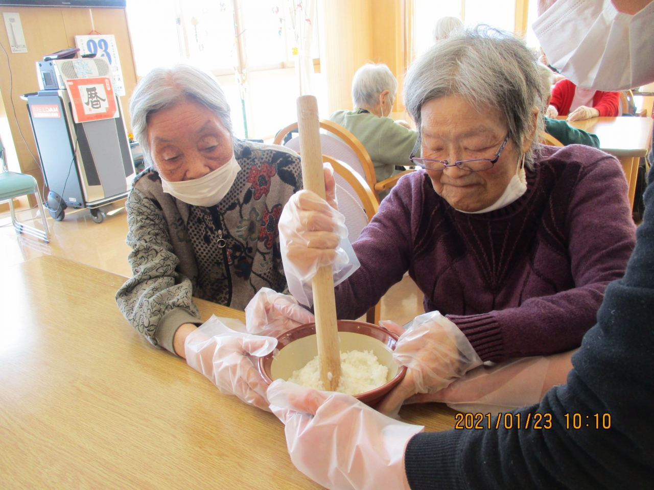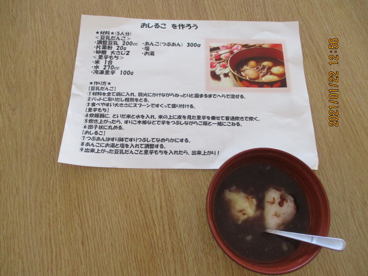 大寒を迎え毎日氷点下の寒い日々が続きますね。そんな寒いなかでも、デイサービス回春堂花沢ご利用の皆様は元気にお越しくださいます。この寒さを乗り越えようと今月はおしるこ作りをしました。お餅をつきたいところですが、飲み込みやすさを考えて、柔らかーい里芋餅と豆乳だんごをいれています。ご飯&里芋、粒あんをつぶす作業を皆様一生懸命ご協力くださいました。みんなで作ったおしるこはとってもおいしくて寒さ乗り越えられそうです♬元気を頂いたお菓子作りでした。